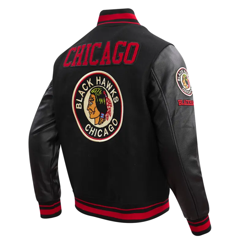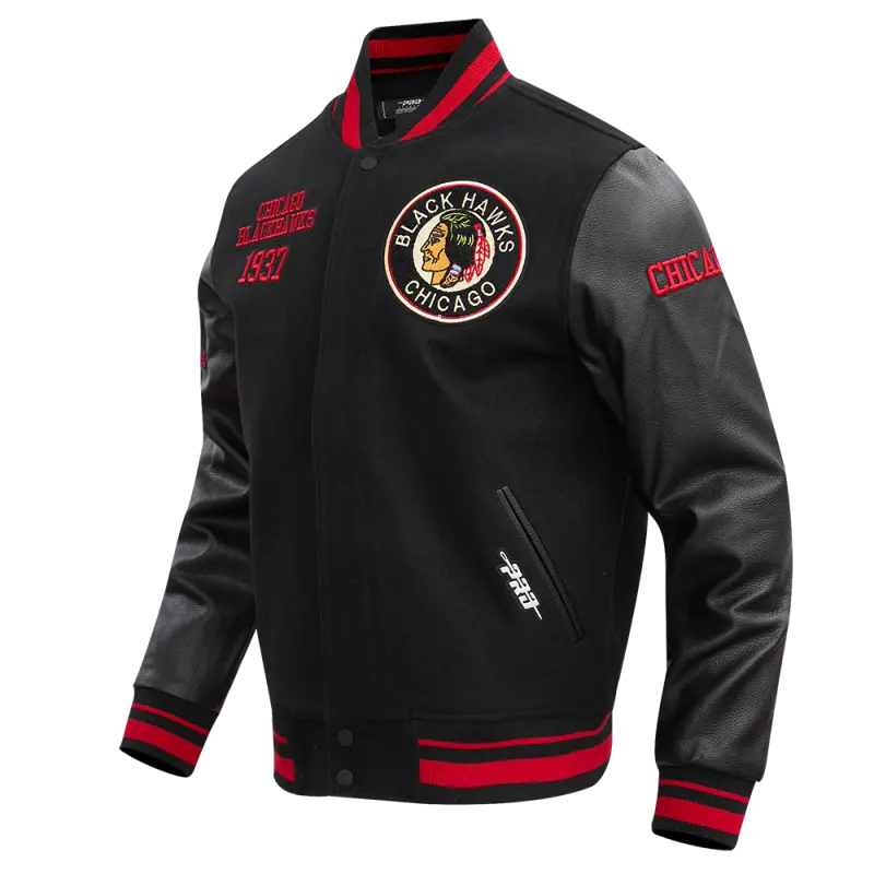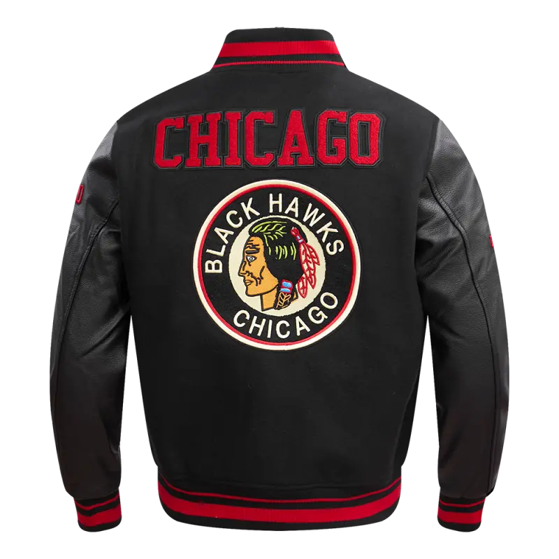 NHL CHICAGO BLACKHAWKS RETRO CLASSIC MEN’S RIB WOOL VARSITY JACKET (BLACK\/RED\/BLACK)